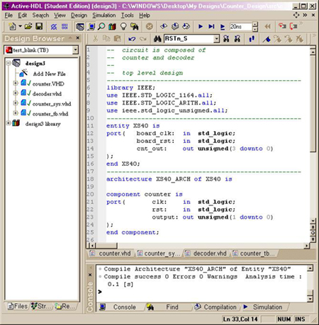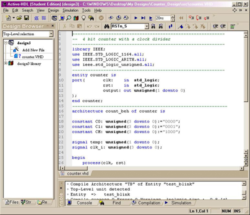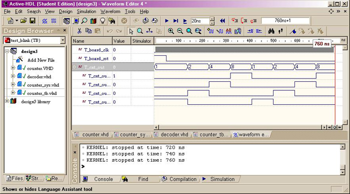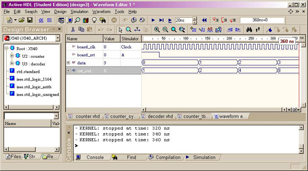 You can perform either a single step simulation, which is useful for source code debugging, or a continues simulation. Finish simulation by selecting the End Simulation option in the Simulatior menu. Save your waveform before exit.